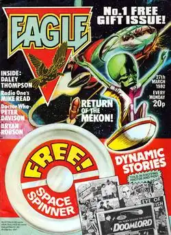 Tomlinson arranged a lavish press launch for Eagle with Tony Kelleher (son of artist agent Pat Kelleher) playing Dan Dare and wrestler Big Daddy making an appearance.[5] The first issue – dated 27 March 1982 – had a print run of 350,000 copies,[14] and the launch drew coverage from the mainstream press, including The Daily Telegraph, The Times and the Daily Star.[6]