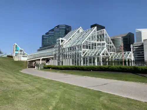 East 9th–North Coast station (signed as North Coast) is a station on the RTA Waterfront Line in Cleveland, Ohio. The station is located west of East 9th Street and serves the North Coast Harbor area, after which the station is named. The station also serves the northern portion of Downtown Cleveland, including Cleveland City Hall.
