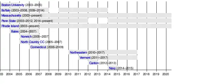 United States Naval AcademyState University of New York at CantonUniversity of VermontNortheastern UniversityUniversity of ConnecticutNorth Country Community CollegeNorwich UniversityBates CollegeRhode Island Rams women's ice hockeyPenn State Women's Ice Hockey ClubUMass Minutemen women's ice hockeyUniversity at BuffaloBoston University