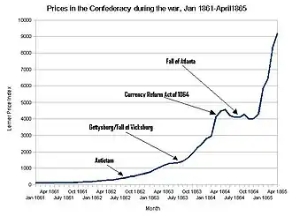 The financing of war expenditures by the means of currency issues (printing money) was by far the major avenue resorted to by the Confederate government. Between 1862 and 1865, more than 60% of total revenue was created in this way.[36] While the North doubled its money supply during the war, the volume of money in the South increased 20 times over from 1861 to 1865, and prices soared. An item that cost one Confederate dollar in 1861 cost 92 of these dollars in 1865.[37]