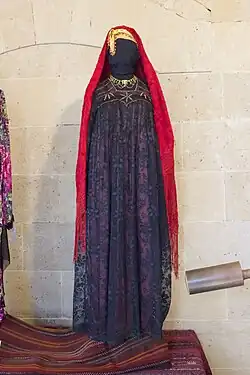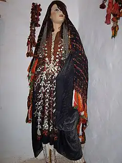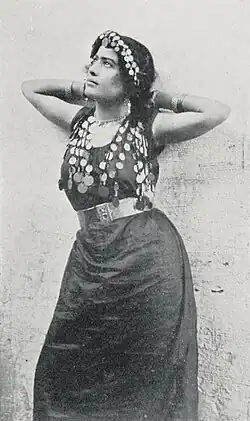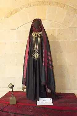 One of the outer garments was the aforementioned tob, thob, sebleh, or tob sebleh, which was a large, loose caftan with very wide sleeves, usually in a black or blue color. A poor woman's might be made of cotton. A wealthier woman's could be cotton with silk stripes, taffeta, or watered silk.[24] Sometimes the wealthy woman's tobs were rose, pink, or violet in color, but a poor woman's was typically blue.[26] Mantles such as the melaya leff were also worn, as were face veils,[22] and the tarha, a scarf worn over the head and down the back. The tarha was of embroidered white muslin, colored crepe with gold embroidery and spangles, or dark blue cotton or linen for poor women. The face veil was black or deep blue, and sometimes decorated with gold or silver pieces, false pearls, coral, and chain tassels.[26]