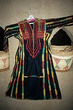 In Bariz, The dress is of the T shape type, with slightly narrowed sleeves and a small flare to the skirt. It is made of black cotton. The more elaborate embroidered dresses also are mostly embroidered on a center front rectangle, though the major section may stip below the bust instead of going all the way down to the hem. The embroidery on the edge of the neckline is narrower. The body has motifs of descending trefoils, lines of triangles, chevrons, crosses, herringbones, and dashed lines, mostly arranged vertically. These are fewer in number and spaced further apart than the dresses of Qasr Kharga. Coins are sometimes sewn on as decoration. The enlarged neckline frame noted in Qasr Kharga is present, and the point of it extends into a giant diamond, with the horizontal points sitting on the top of the sleeve, and the vertical points mirroring each other on the front and back panels of the dress. This fastens on a lining. The seams are outlined with simple embroidery, and these and the diamond are the only embroidery on the back. The sleeves may have a few additional lines of simple embroidery, which is also seen on Upper Egyptian dresses, as are the seam outlines. The shoulder bands are made of small lines of triangles and diamonds and may have descending trefoils sprouting from them onto the sleeves. The slightly simpler dresses get rid of the diamond extension of the englarged neckline frame, and may get rid of it all together. The embroidery is reduced in complexity, and there is less of it; fewer lines and little to no sleeve decoration. The embroidery that does not outline the seams is likely to stop before the hem. Fewer coins are used as decoration. The simplest embroidered dress has the enlarged neckline frame, and two lines going down from its outer vertical lines, straight to the hem. It also has a narrow border of embroidery on the neckline edge itself. The embroidery colors are green, yellow, orange, pink, and most predominantly, red. The thread is silk or cotton.[49]