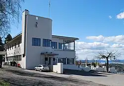 The Functionalist building was first completed in 1929, drawn by architect Lars Backer. The restaurant has flat roofs, large windows, a terrace and an arched entrance in a corner tower. The architect maximized the number of window seats.[1]