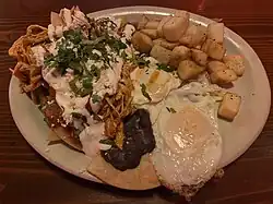 El Chupacabra's menu has included burritos,[1] nachos, tacos al pastor, rice and beans, tortilla chips with guacamole and salsa, horchata,[2] and margaritas.[6] The restaurant has also served enchiladas, fried jalapeños, huevos rancheros,[8] pozole with pork, quesadillas, tortas,[1] and black-bean dip.[3] The "Texas Tacos" are soft tacos with flour tortillas.[8] Salsa varieties include chipotle pineapple, roja, and verde.[1] El Chupacabra has gluten-free as well as vegan- and vegetarian-friendly options.[4][10] The restaurant has offered a happy hour menu with food and drinks specials.[11][12]