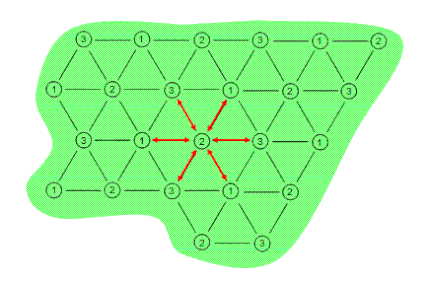 There are predominantly two electrical load arrangements for ERH: three-phase and six-phase. Three-phase heating consists of electrodes in a repeating triangular or delta pattern. Adjacent electrodes are of a different electrical phase so electricity conducts between them as shown in Figure 1. The contaminated area is depicted by the green shape while the electrodes are depicted by the numbered circles.