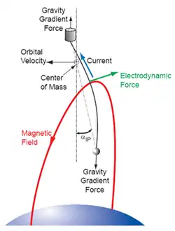 Electrodynamic tethers (EDTs) are long conducting wires, such as one deployed from a tether satellite, which can operate on electromagnetic principles as generators, by converting their kinetic energy to electrical energy, or as motors, converting electrical energy to kinetic energy.[1] Electric potential is generated across a conductive tether by its motion through a planet's magnetic field.