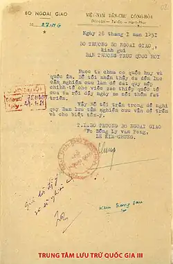 During the 1950s, a number of countries around the world established diplomatic relations with the Democratic Republic of Vietnam.[3] In order to expand relations with other countries and affirm Vietnam's sovereignty through diplomatic activities, the Ministry of Foreign Affairs has sent an official dispatch to the National Assembly Standing Committee on the creation of the national emblem.[3] The Workers' Party of North Vietnam and the North Vietnamese government advocated for the creation of a national emblem "to achieve orderliness for international dealings".[3] The coat of arms was designed by artist Bùi Trang Chước and was edited by artist Trần Văn Cẩn.[4][5]