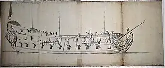 The English ship Winsby cost the navy £3,932. It was built at Great Yarmouth in Norfolk under the direction of master shipwright Edmund Edgar. She had a length at the gun deck of 104 ft (31.7 m), a beam of 33 ft 2 in (10.1 m), a draught of 17 ft 0 in (5.2 m), and a depth of hold of 13 ft 2 in (4.0 m). The ship's tonnage was 605 tons burthen. Originally built for 50 guns,[4] by 1666 she was carrying 52 guns (8 sakers, 22 culverins, and 22 demi-culverins). By 1685, this had changed to 48 guns (22 culverins, 20 demi-culverins and 6 demi-culverin cutts). The ship had a crew of 190 officers and ratings in 1666.[3]