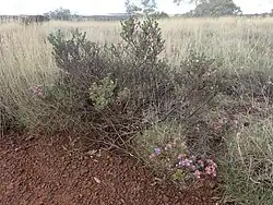 Eremophila cuneifolia, commonly known as pinyuru,[2] is a flowering plant in the figwort family, Scrophulariaceae and is endemic to the north-west of Western Australia. It is a spreading, sticky shrub with wedge-shaped leaves, coloured sepals and usually deep purple flowers.