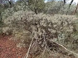 Eremophila phyllopoda is a compact, flat-topped shrub or a spreading shrub depending on subspecies, and grows to a height of between 0.4 and 2 m (1 and 7 ft). Its branches and leaves are covered with a layer of silvery to dull grey simple hairs that are sometimes stained brown. The branches are rough due to the prominent, projecting leaf bases and sticky due to the presence of resin. The leaves are arranged alternately and clustered near the ends of the branches. They are linear to elliptic in shape, taper towards both ends, 18–110 mm (0.7–4 in) long, 1.5–7 mm (0.06–0.3 in) wide, have a covering of hairs which are pressed against the leaf surface and sometimes obscured by resin.[2][3]