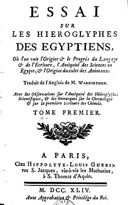 The Essai translated a section (book IV of volume 2) of The Divine Legation of Moses (from 1737) by William Warburton, thought by the original author to have value independent of his main religious thesis.[1][2] The work of de Malpeines, the translator, appeared under the longer title Essai sur Les hiéroglyphes des Égyptiens, où l'on voit l'origine et le progrès du langage et de l'écriture, l'antiquité des sciences en Égypte, et l'origine du culte des animaux.[3] It was based on 140 pages of the original work of Warburton, which in all ran to over 1000 pages. Those pages are the part of the work that is now most remembered.[4]