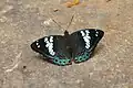 Female. Similar, paler. Upperside forewing: the transverse crimson bands in cell obscure with a broad black-bordered white band interposed, the discal series of white spots very large, very irregular in shape. Hindwing: the ground colour suffused with greenish blue on terminal posterior half of wing; markings similar to those of the male. Underside brown, the tornal half of the hindwing bluish green. Forewing: the markings as on the upperside with the addition of two small black spots at base and an obscure broad terminal pale band. Hindwing with four black-bordered transverse crimson spots at base in addition to the markings as on the upperside. Antennae, head, thorax and abdomen as in the male, but paler; the palpi beneath with a stripe of pink, the forelegs whitish.[4][5]