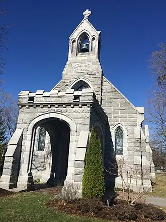 Wilde Memorial Chapel is a Gothic-style chapel. It was built as a mortuary chapel by Falmouth native Mary Ellen Lunt Wilde in 1890. It was designed by Portland architect Frederick A. Tompson and gifted to the city in 1902.[6] The granite building is used for both memorial and wedding services, with a maximum capacity of 105.[7]