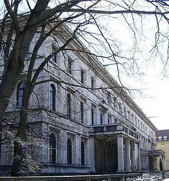 The design of the many buildings of the cultural center were assigned to various architects Hitler favored.[26] The museum itself was designed by Roderich Fick[27] based closely on Hitler's sketches and specifications, modeled somewhat after Paul Ludwig Troost's Haus der Deutschen Kunst ("House of German Art") in Munich – itself strongly influenced by Hitler's participation in the design process[28] – and would feature a colonnaded facade about 500 feet (150 meters) long. It would stand on the site of the Linz railroad station, which was to be moved four kilometers to the south.[14][29] Should the volume of German art bought, confiscated and plundered for the museum be such that expansion was needed, an additional building could easily be integrated into the planned district.[14]