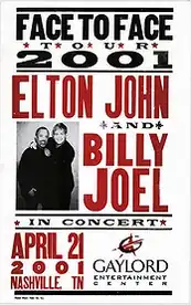 In the winter of 2001, Elton John and Billy Joel toured with their Face to Face concert series.[1][2] The tour started in Honolulu, Hawaii (where they had not performed together before).[3] The first leg of the tour closed at the MGM Grand Garden Arena in Paradise, Nevada, on 17 and 18 February.[4]