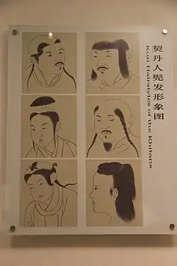 Kithan's men hairstyle was called kunfa (髡髮) according to Chinese texts.[7]: 21  Khitan wore the long side fringes & shaved pates.[11] Tomb murals of Khitan hairstyle show only some hair remaining near the neck and forehead with the rest of the head shaved.[12] Only at the temples were hair left while the crown was shaven.[10] The absence of Khitan clothes and hairstyles on a painting of riders previously identified as Khitan has lad to experts questioning their purported identity.[13] Khitan males grew hair from their temples but shaved the crown of their heads.[14] Khitan men might have differentiate between classes by wearing different patterns on their small braids hanging off their shaved foreheads. They wore the braids occasionally with a forehead fringe with some shaving off all the forehead.[3]: 53, 190  Khitan men left only two separate patches of hair on each of the forehead's sides in front of each ear in tresses while they shaved the top of their head.[14]