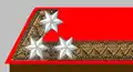 The rank insignia was a gorget patch on the stand-up collar of the so-called Waffenrock (tunic), and consisted of three white stars on 13 mm ragged yellow silk galloon. The gorget patch and the stand-up collar showed the particular Waffenfarbe (corps colour).