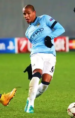 Fernando scored his first goal for City on 26 December 2014, contributing to a 3–1 away victory over West Bromwich Albion.[17] He featured 90 minutes in the final of the League Cup on 28 February 2016, helping defeat Liverpool on penalties.[18] On 4 May, he scored an own goal after 20 minutes of the UEFA Champions League semi-final fixture against Real Madrid at the Santiago Bernabéu – the first time the club coached by Manuel Pellegrini had reached that stage[19]– in an eventual 1–0 loss (also on aggregate).[20][21]