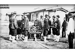 The fire fighting system of the Joseon period was established in 1426 (Sejong 8th year), the first firefighting organization specialized in the Korean Peninsula was set up under the salary, and began taking charge of the fire protection work.[6] Initially, the forbidden army suppressed the fire, renamed the fire battalion as Ghum-Hwa(금화,禁火. fire fighter) in the dynasty era and working for 24 hours.[7][8]