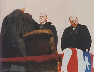 Chief Justice Melville Fuller administering the oath to McKinley as president in 1897. Outgoing president Grover Cleveland stands to the right.