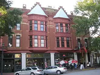 It was designed by architects Golucke and Stewart. Its Queen Anne exterior detailing includes its "rich mixture of building materials, textures and forms...brick, stone, metal, a corner turret, a balcony, bay windows, stained glass, garlands and swags [that] are combined here in a lively yet coherent manner."[4]