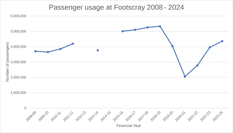 Passenger usage at Footscray Station between 2008 and 2024 sorted by financial year.