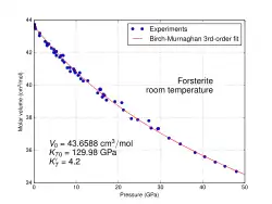 At high pressure, forsterite undergoes a phase transition into wadsleyite; under the conditions prevailing in the Earth's upper mantle, this transformation would occur at pressures of ca. 14–15 GPa.[14] In high-pressure experiments, the transformation may be delayed so that forsterite can remain metastable at pressures up to almost 50 GPa (see fig.).