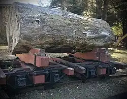 Redwood log loaded on an early 20th century flatbed railcar, historic logging outdoor museum