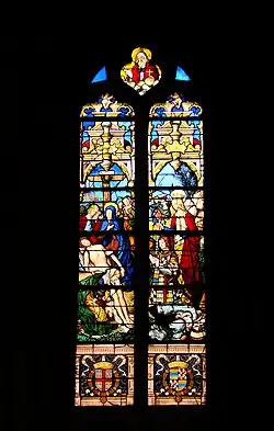 Stained glass relief showing the sieur de La Rochepot kneeling on the right, the arms of Montmorency are quartered with those of Pot on his tunic