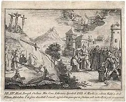 As told by the Bychowiec Chronicle, Voivode of Vilnius Petras Goštautas married a Polish lady from the House of Buczacki and converted to Catholicism.[1] He invited 14 Franciscan friars from Podolia to Vilnius and built them a friary. At the time the Grand Duchy of Lithuania was still a pagan country; it would convert to Christianity in 1387. The friars began preaching the Christian faith and badmouthing pagan gods. That angered city residents. While Algirdas was away at war with Moscow and Goštautas was away in Tykocin, the residents burned down the friary and killed the friars. Seven friars were beheaded while other seven where nailed to a cross and tossed into the Neris river. Upon their return, Goštautas provided proper burial to the slain men and Algirdas ordered execution of 500 city residents.[1] Goštautas also founded a new friary (today's Church of the Assumption of the Blessed Virgin Mary).[2]