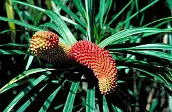 Freycinetia percostata, commonly known as climbing pandan, is a plant in the family Pandanaceae native to New Guinea, the Solomon Islands and the Northern Territory and Queensland in Australia. It is a root climber with stems up to a maximum of 3 cm (1.2 in) diameter. Leaves are long and narrow with parallel venation, and are arranged in closely packed spirals. Auricles are present at the leaf base and the margins are finely toothed. The species is dioecious, meaning that pistillate (functionally female) and staminate (functionally male) flowers are borne on separate plants. Inflorescences consist of spadices and are surrounded by orange bracts. Fruit are a multiple fruit consisting of numerous red berries about 1 cm (0.39 in) wide.[4][5][6]