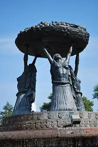 The original fountain was installed next to the city's aqueduct in October 1931 and featured a colorful concrete sculpture. It was a work by Antonio Silva Díaz and Benigno Lara. It featured three bare-chested kneeling women holding a basket of fruits. They wore blue rebozos on their heads and skirts of the same color.[2] The meaning of the work was never explained and they never received an official name. Citizens commonly referred to them as "Fuente de las Indias" (Indians Fountain), but the government later promoted them as the "Fuente de las Tarascas" (Tarascans Fountain) after the Indigenous group found in the state of Michoacán. The sculptures received criticism for being naked. On 25 August 1965, the sculptures were removed and were transported to the offices of the State Treasury, 800 m (2,600 ft) away from their original location. They were removed as the municipal president, Fernando Ochoa Ponce, considered them to be out of harmony with the area and lacked any value or meaning. They were replaced by a fountain named El Huarache by Ángel Díaz. Since 1967, the original sculpture is located at Expo Feria Morelia. At some point, the fair changed its location and the sculpture was moved to the new site. However, the fruit bowl was permanently damaged. It was replaced with a smaller version.[3][4][5]