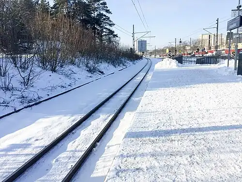 Galoppfältet is a Swedish railway station connected by Roslagsbanan in Täby municipality. Named after the nearby Täby Racecourse (Täby Galopp), the station is located about 13 km from Stockholm Östra station. It consists of a middle platform with entrances from both sides.
