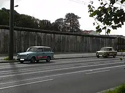 The memorial includes a 60-metre (200 ft) long section of the wall as it was when the Wall fell.[6] Seen from the west, a wall built from L-elements was lined by a sandy section, a lighted Kolonnenweg, a signal fence, and an inner wall. Finally a tower was built within the complex. The area is not accessible to visitors;[7] both ends of the original wall are closed by stainless steel.[6] The northern wall bears the inscription "In Erinnerung an die Teilung der Stadt vom 13. August 1961 bis zum 9. November 1989 und zum Gedenken an die Opfer kommunistischer Gewaltherrschaft" ("In memory of the city's division from 13 August 1961 to 9 November 1989 and of the victims of communist tyranny").[8]