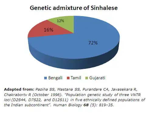 An Alu polymorphism analysis by Mastana S (2007) using Sinhalese, Tamil, Bengali, Gujarati (Patel), and Punjabi as parental populations found the following proportions of genetic contribution. The Sinhalese sample size used was 121 individuals.:[2]