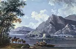 In the summer of 1777 Henry Penruddocke Wyndham made his second tour through Wales accompanied by the Swiss artist Samuel Hieronymus Grimm, who is very likely to have known Barret. Wyndham's Tour through Monmouthshire and Wales published in 1781, started with at the Severn and worked round the Welsh coast to Snowdonia before returning along the Welsh borders. This was a route followed by many tourists and Wyndham's book was the first published guidebook with illustrations of the scenery. Surviving oil-paintings by Barret suggest that he must have made a similar tour, starting in the south and many of his oil paintings are taken from similar viewpoints to those used by Grimm.[39] The Government Art Collection has oil-paintings by Barret of both the Severn and Wye confluence and Cilgerran Castle on the borders of Cardiganshire and Pembrokeshire. There are a number of paintings which may portray scenery in Merionethshire and in Snowdonia Barret produced a number of paintings of Snowdon from Llyn Nantle and Llyn Padarn. Unlike Richard Wilson he did not paint Caernarfon Castle, but he did produce at least five different versions of a painting of Conway Castle.[40]