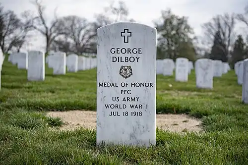 George Dilboy (Americanized transliteration of Greek name, Georgios Dilvois: Γεώργιος Διλβόης), (February 5, 1896 – July 18, 1918), Private First Class, U.S. Army, Company H, 103rd Infantry Regiment (United States), 26th Division is thought to be the first Greek-American to receive the Medal of Honor during World War I. He led an attack on a machine gun position and continued to fire at the enemy despite being seriously wounded, killing two of the enemy and dispersing the remainder of the gun crew. General John J. Pershing, commander of all the American forces in France during the war, listed George Dilboy as "one of the ten great heroes" who "died in the battlefield of France with super-human heroism and valor."[1] Dilboy is buried in Section 18 of Arlington National Cemetery.