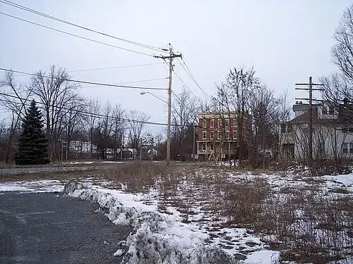 General location of former station. Note the former railroad hotel which is on the National Register of Historic Places.