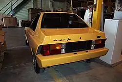 The working prototype was built in sheet aluminum on a Fiesta platform with the wheelbase shortened by 10 in (254 mm) and modified to house a new fuel tank shape with its capacity reduced to 20-25 litres. the design was of a "formal notchback" theme with an integrated rear spoiler for improved aerodynamics. The front features rectangular double sealed-beam headlights, possibly faired with transparent plastics, and federalized bumpers (the integrated front one with spoiler shape).[7]