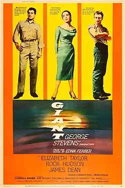 Giant is a 1956 American epic drama film directed by George Stevens, from a screenplay adapted by Fred Guiol and Ivan Moffat from Edna Ferber's 1952 novel.[2] The film stars Elizabeth Taylor, Rock Hudson, and James Dean; and features Carroll Baker, Jane Withers, Chill Wills, Mercedes McCambridge, Dennis Hopper, Sal Mineo, Rod Taylor, Elsa Cárdenas, and Earl Holliman.
