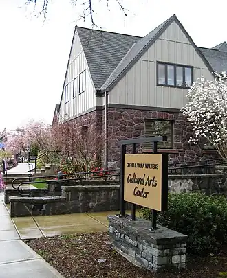 Located on Main Street at Fifth Avenue in downtown Hillsboro, the center is two blocks from the Hillsboro Central/3rd Avenue Transit Center MAX light rail station.[5] The building covers 15,664 square feet (1,455.2 m2) of space and contains five classrooms, a lobby, meeting rooms, a box office, exhibition gallery, and an auditorium.[5] The main part of the building has rock walls, and the auditorium contains high, arched ceilings and stained-glass windows.[5] Once featuring a stone chimney, contractors removed the chimney during conversion to the center and inserted an elevator to comply with ADA requirements.[5]