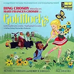 Goldilocks is a 12" soundtrack vinyl album taken from the live-action/animated De-Patie-Freleng TV film Goldilocks shown on NBC on March 31, 1970. It was first released in 1970 as DL-3511 by Disneyland Records for a special promotion of Evans-Black Carpets by Armstrong.[1] The album could be purchased for $2.25. When the promotion period had expired, the album was re-released by Disneyland Records as ST-3889 with an accompanying 12-page storybook. The recording is particularly important to the Bing Crosby career as he recorded commercial tracks in every year from 1926 to 1977 and this album represents his only recording work for 1969.[2]