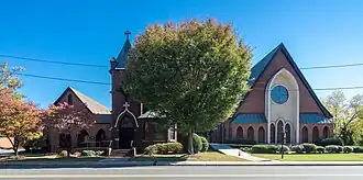 Grace Episcopal Church is a historic Episcopal church located at 419 S. Main Street in Lexington, Davidson County, North Carolina. It was built in 1902, and is a one-story, Late Gothic Revival-style red brick building. It features a steeply pitched gable roof, lancet-arched doors and windows, buttresses, a front corner bell tower, and a three-part stained-glass window produced by Tiffany Studios in 1918.[2]