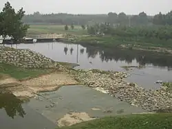The Grand Canal has been upgraded to serve as the Eastern Route of the South-North Water Transfer Project.[47][48][49] Additional water is pumped into the canal from the Yangtze at Jiangdu near Yangzhou using a 400 m3/s (14,000 cu ft/s) pumping station.[50] and repumped through 23 stations until it reaches the watershed at Nanwang. Afterwards the water flows by gravity, one secondary canal going to the Shandong peninsula,[51] and the main canal bypasses the Yellow River through 7.9 km tunnels[52] and flows through a modified route into reservoirs in Tianjin.[53] The extra waterflow has allowed the start of several projects to reestablish shipping in the northern half of the Grand Canal.[54][55][56]