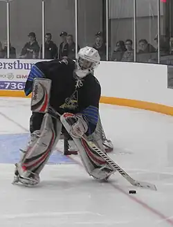 Amherstburg's goalie playing the puck at their 2013 home opener.