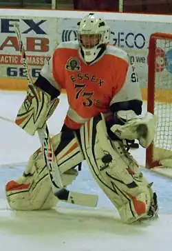 Essex 73's goalie in 40th anniversary commemorative jersey during 2013 Schmalz Cup finals.