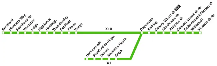 Green Line routes X1 and X10 were limited-stop express coach services which were operated by Stephensons of Essex as part of the Green Line Coaches network. The services operated between Rochford, Southend and London. The original X1 route was introduced in 1980 by Southend Transport and Reading Transport, and also served Reading.