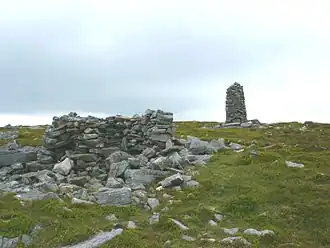 The summit is marked by a nearby sheep shelter and an unusual and conspicuous cairn - taller and more rectangular than most others locally. (This may, perhaps, be the origin of the curious name "chapel"?)