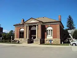 The first library in Grimsby was opened in 1871 in the home of Grimsby councillor Sam Mabey, housing a collection of 1,000 books.[27] Following a recommendation of the town council, the village struck a committee to approach the Andrew Carnegie Foundation to request new funds to build a new library. The foundation allocated $8,000 to build the new library building.[27] In 1975, the library was expanded to include a new building, which inaugurated a Grimsby Public Art Gallery in the basement of the library. A few years later, the Klosso Eloul sculpture 'Double is One' was installed on the grounds.[27] In 2004, a new building was constructed adjacent to the original structure to house both the library and art gallery. The original structure itself contains the Grimsby Archives.[27]