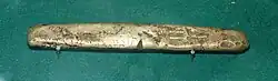As its etymology implies the word originally meant a necklace or a torque. The reason why it has taken the meaning of a unit of weight is unclear. The grivnas that have been found at various archaeological sites are not necklaces but bullions of precious metals, usually silver. The weight and the shape of grivnas were not uniform, but varied by region. The grivnas of Novgorod and Pskov were thin long round-edged or three-edged ingots, while Kievan grivnas have rather the shape of a prolonged rhombus. The material was either gold or silver, but silver was predominant.[3] Originally the weight of a grivna was close to the Roman or Byzantine pound. The weight of the Kievan grivna was around 140–165 g (0.309–0.364 lb). The Novgorod grivna had the weight 204 grams (0.450 lb) and became the basis for monetary systems in northeastern Rus', including the emerging Grand Duchy of Moscow.[4]
